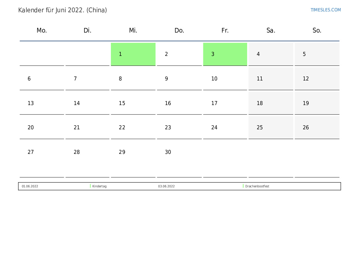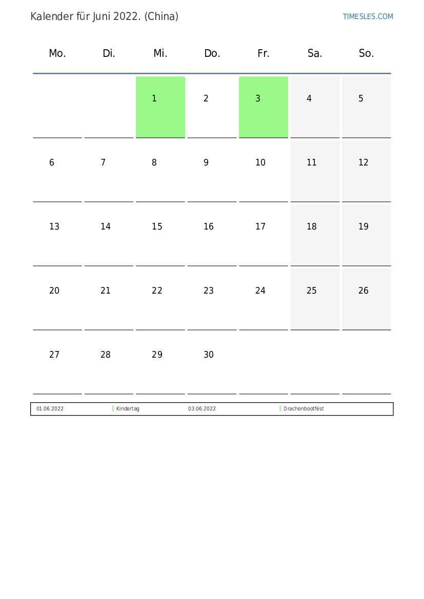 Feiertags- und Wochenendkalender für Juni 2022 für China