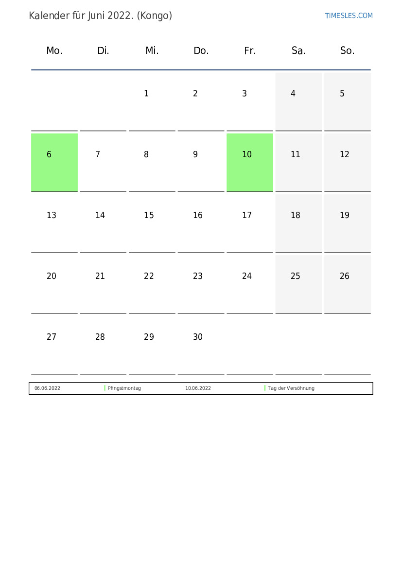 Feiertags- und Wochenendkalender für Juni 2022 für den Kongo