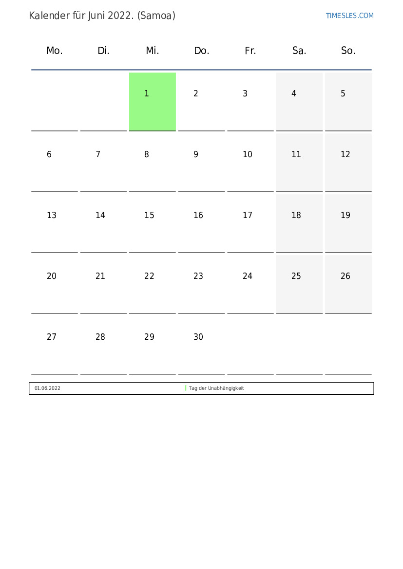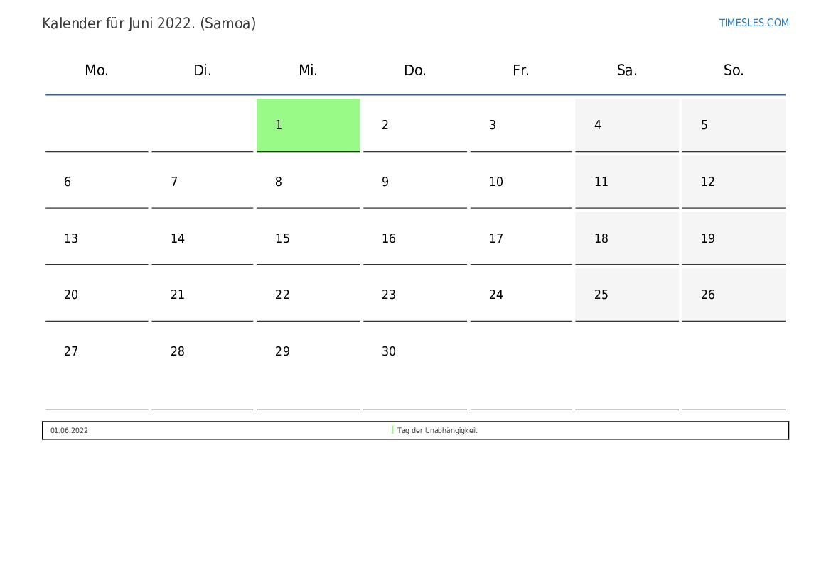 Feiertags- und Wochenendkalender für Juni 2022 für Samoa