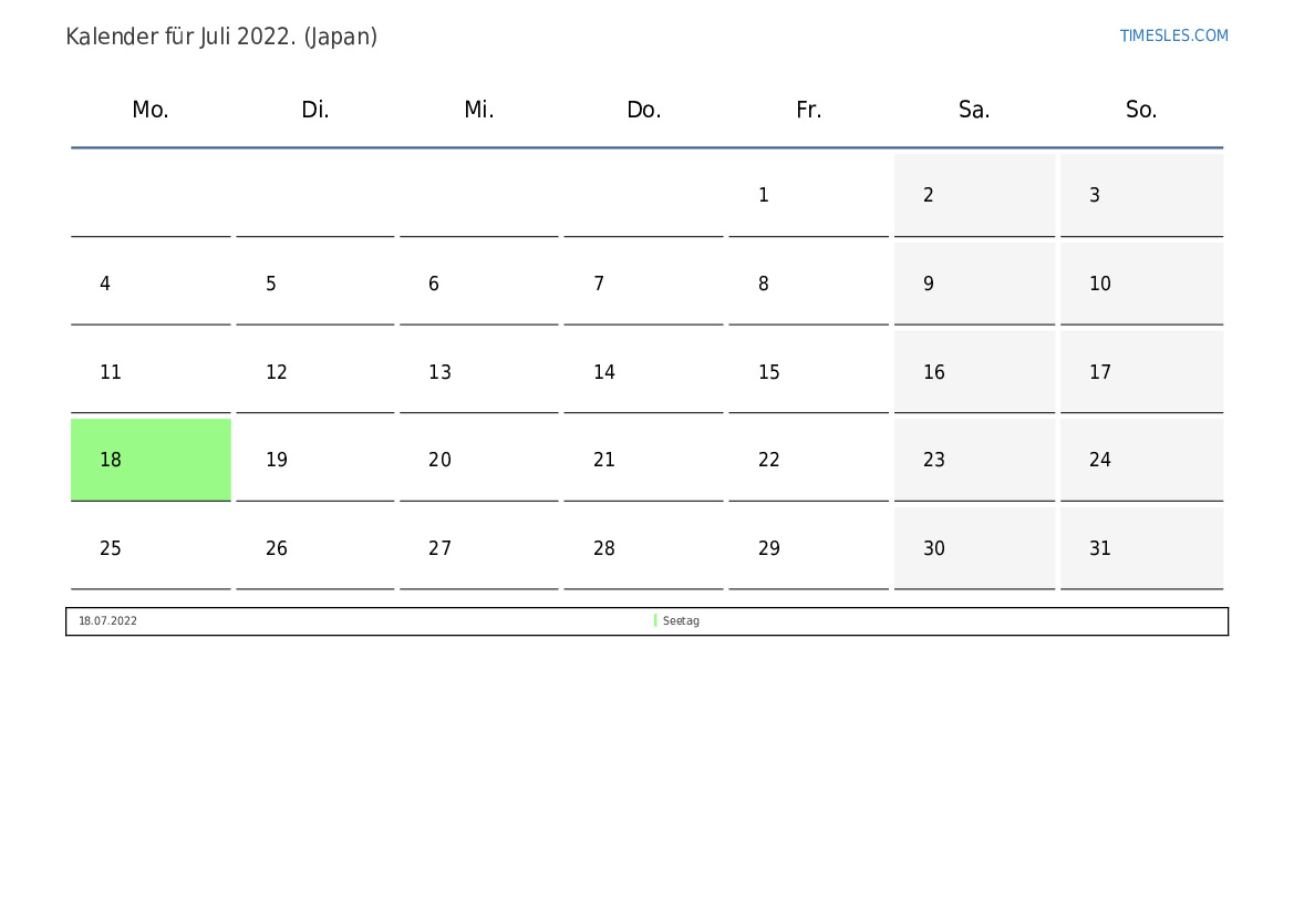 Der Monat Juli enthält 31 Tage. Dies ist 31 Tage Monat 2022. Jahreszeit: Sommer. Der Monat Juli beginnt am Freitag und endet am Sonntag. Im Juli 2022 gibt es in Japan 2 Feiertage und freie Tage.