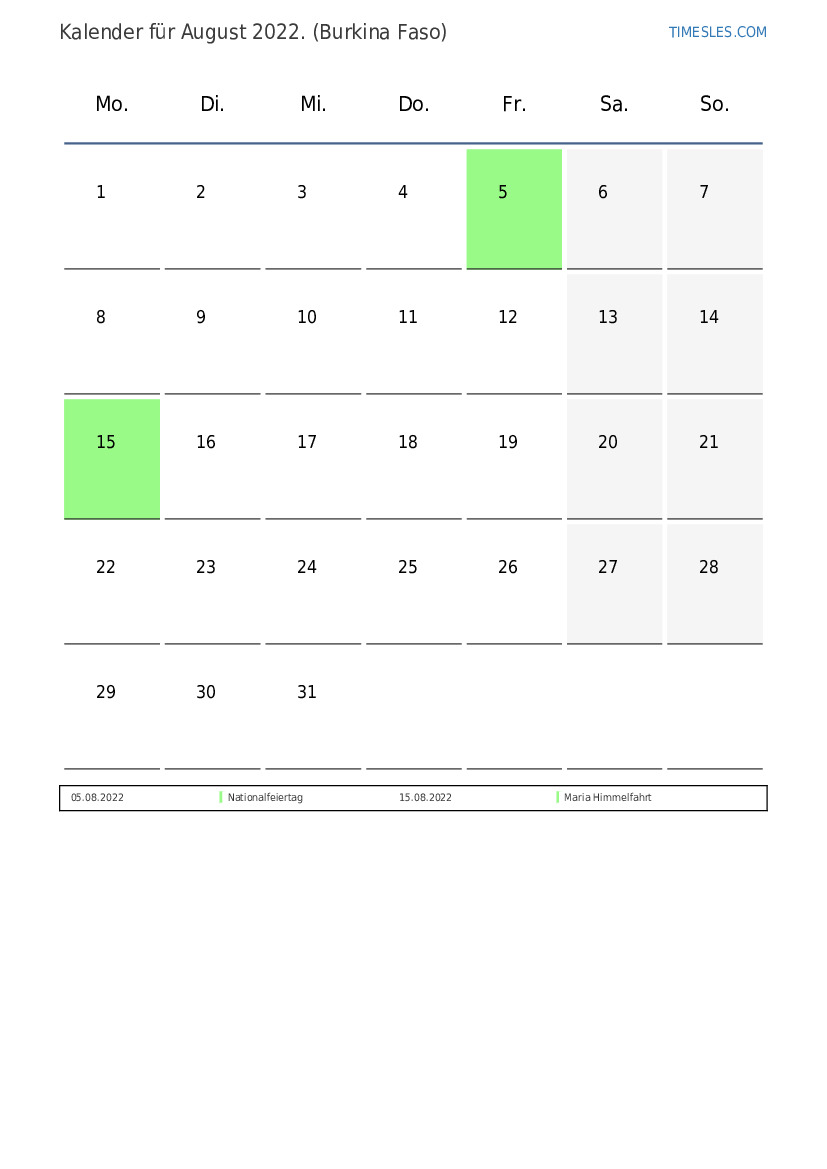 Feiertags- und Wochenendkalender für August 2022 für Burkina Faso