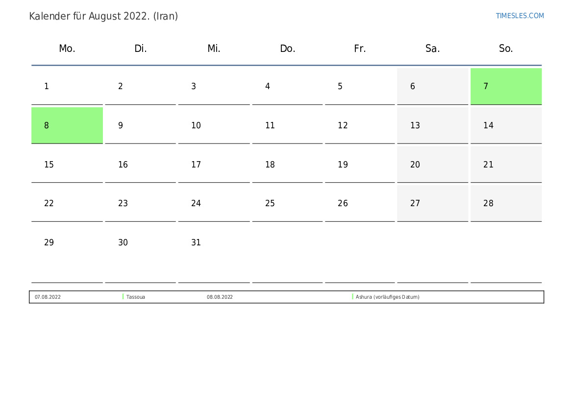 Feiertags- und Wochenendkalender für August 2022 für den Iran