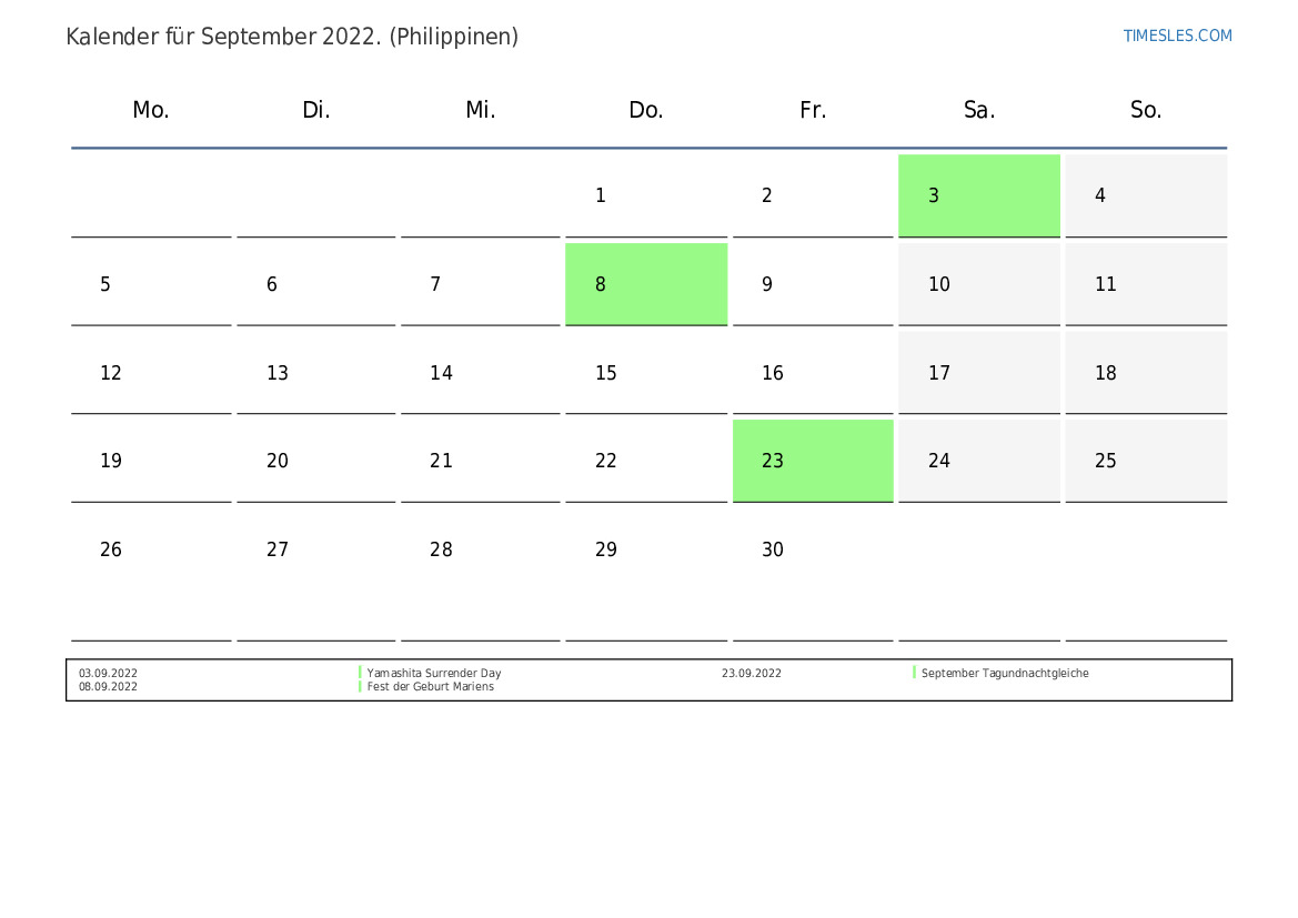Feiertags- und Wochenendkalender für September 2022 für die Philippinen