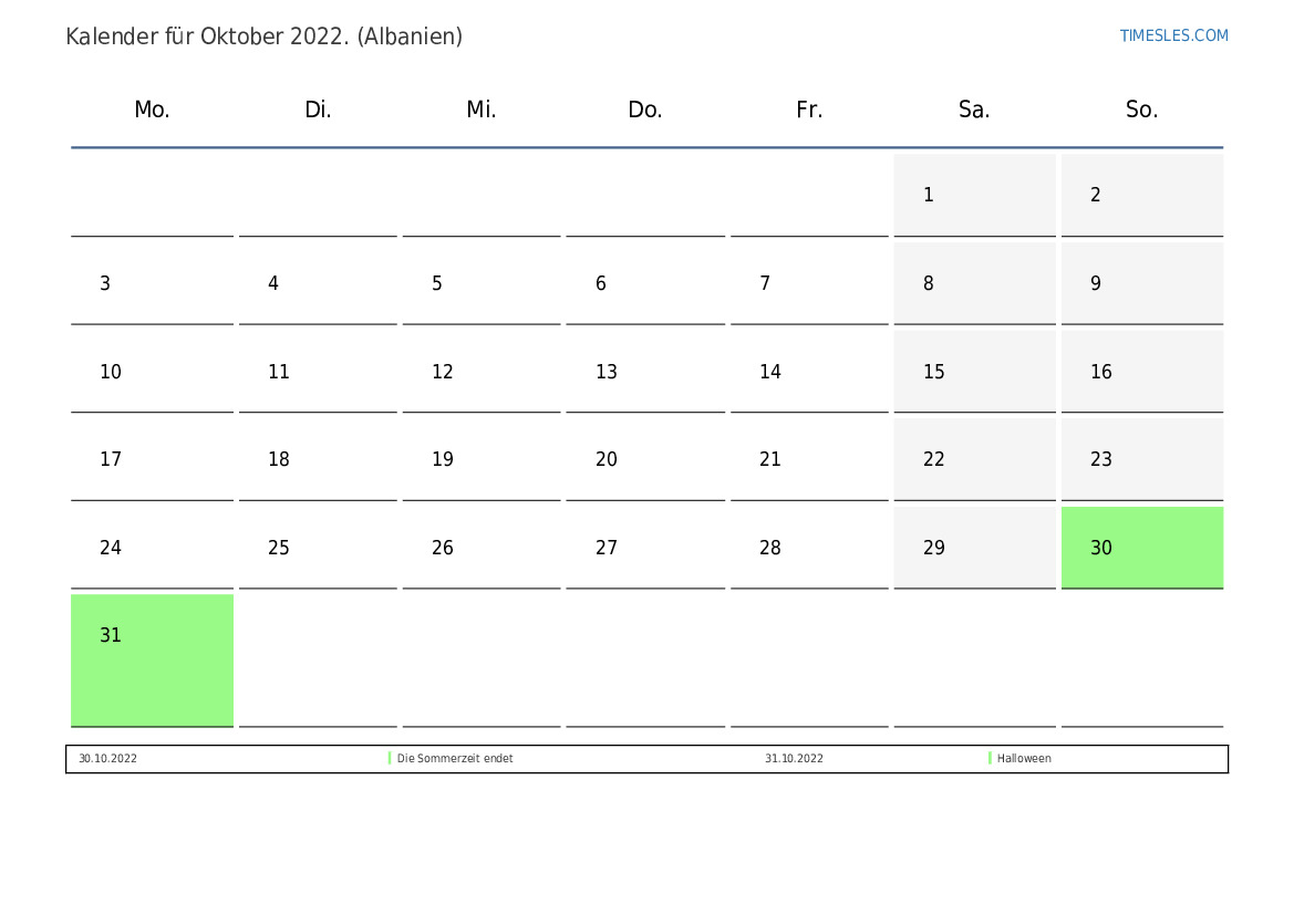 Laden Sie den PDF-Kalender mit Feiertagen und Wochenenden für Oktober 2022 für Albanien herunter und drucken Sie ihn aus