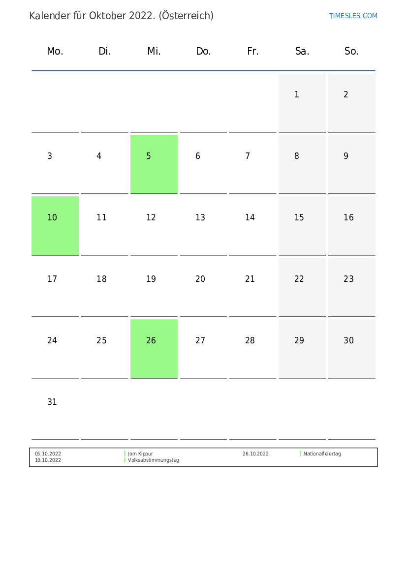 Feiertags- und Wochenendkalender für Oktober 2022 für Österreich