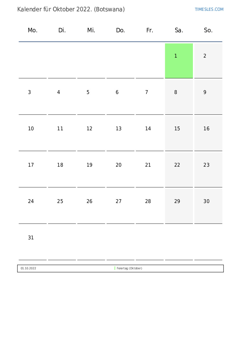 Feiertags- und Wochenendkalender für Oktober 2022 für Botswana