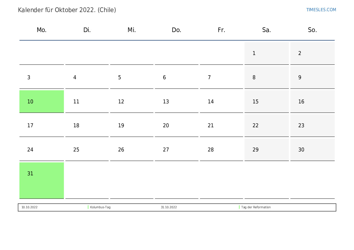 Feiertags- und Wochenendkalender für Oktober 2022 für Chile