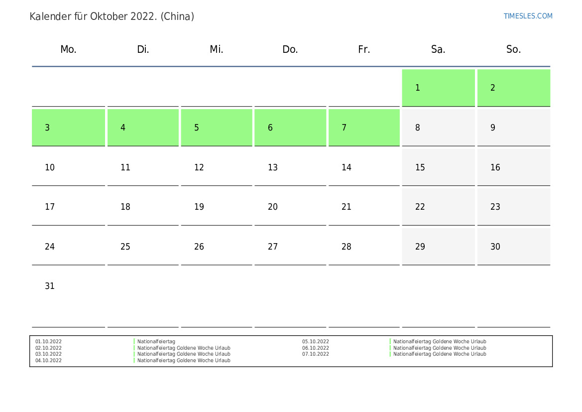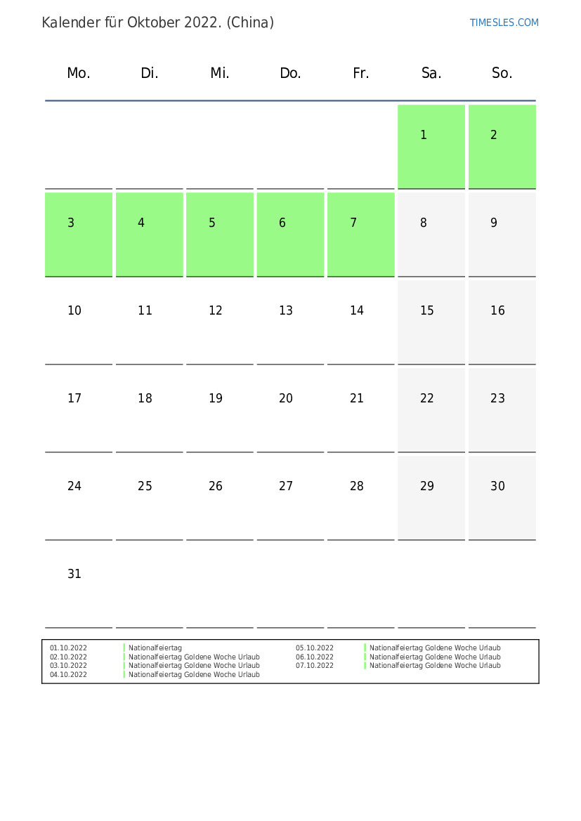 05.10.2022 Nationalfeiertag Goldene Woche Urlaub