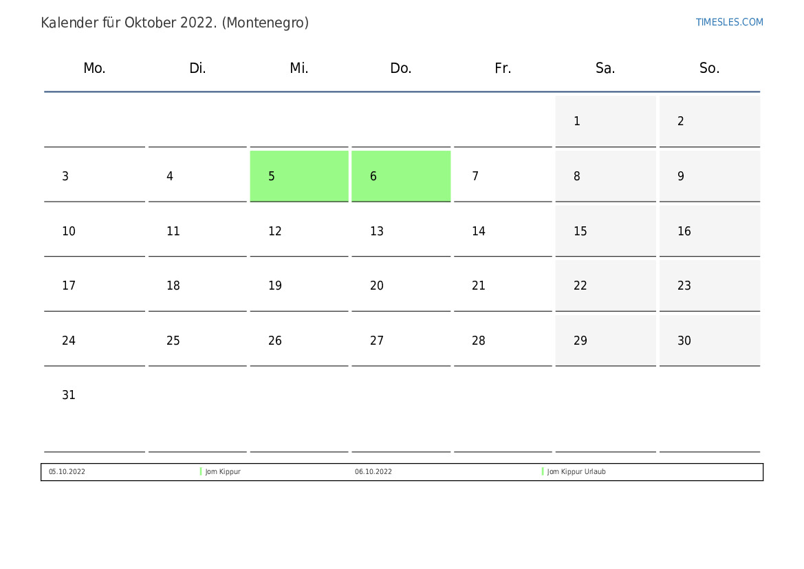 Feiertags- und Wochenendkalender für Oktober 2022 für Montenegro