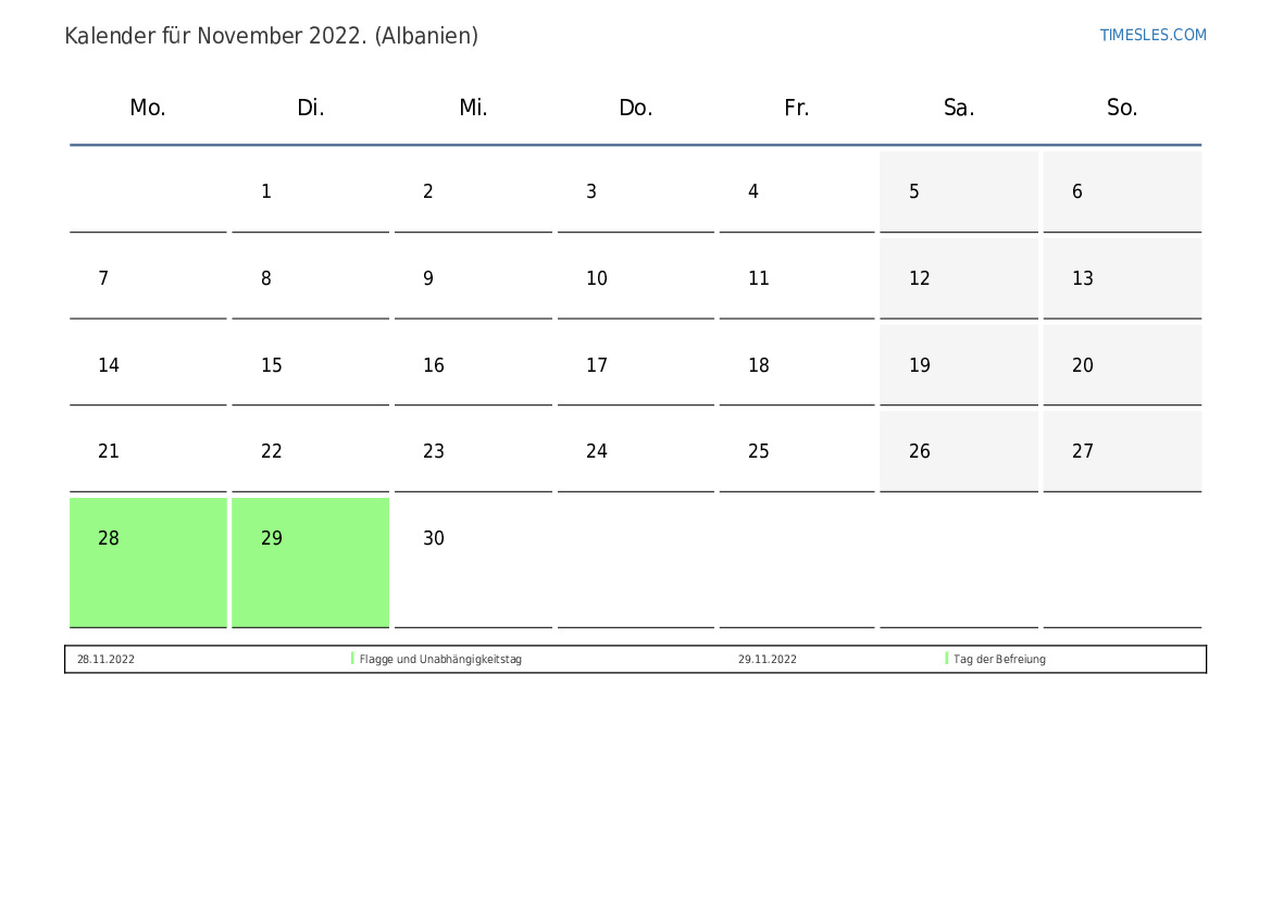 Feiertags- und Wochenendkalender für November 2022 für Albanien