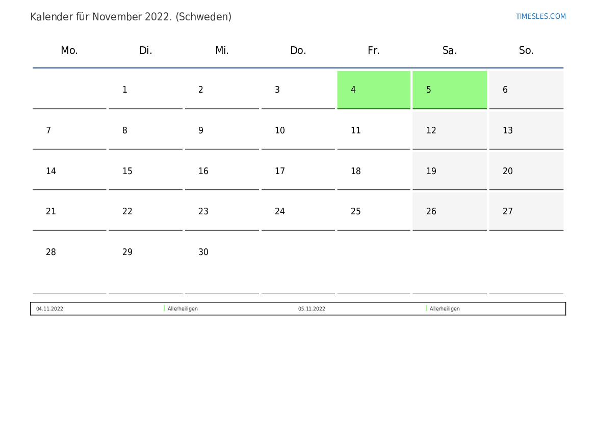 Der Monat November enthält 30 Tage. Dies ist 30 Tage Monat 2022. Jahreszeit: Herbst. Der Monat November beginnt am Dienstag und endet am Mittwoch. Im November 2022 gibt es in Schweden 4 Feiertage und freie Tage.