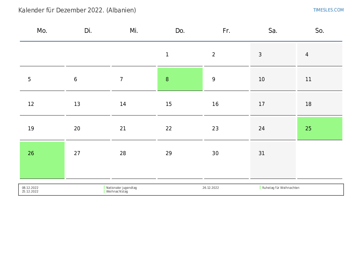 Laden Sie den PDF-Kalender mit Feiertagen und Wochenenden für Dezember 2022 für Albanien herunter und drucken Sie ihn aus