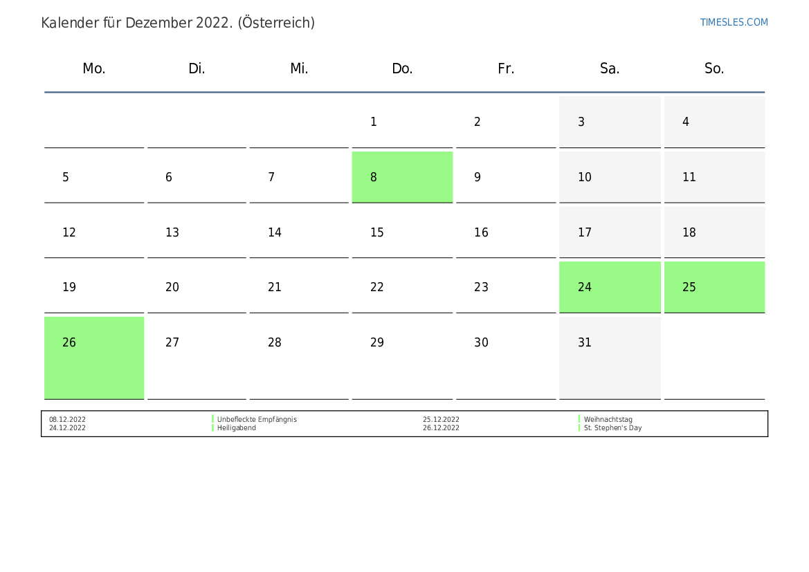 Der Monat Dezember enthält 31 Tage. Dies ist 31 Tage Monat 2022. Jahreszeit: Winter. Der Monat Dezember beginnt am Donnerstag und endet am Samstag. Im Dezember 2022 gibt es in Österreich 6 Feiertage und freie Tage.
