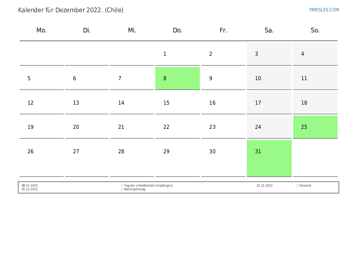 Laden Sie den PDF-Kalender mit Feiertagen und Wochenenden für Dezember 2022 für Chile herunter und drucken Sie ihn aus