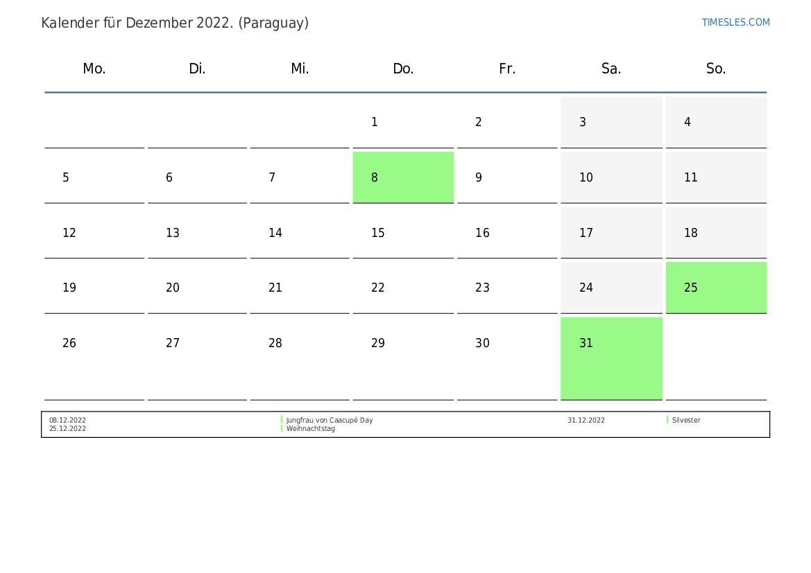 Der Monat Dezember enthält 31 Tage. Dies ist 31 Tage Monat 2022. Jahreszeit: Winter. Der Monat Dezember beginnt am Donnerstag und endet am Samstag. Im Dezember 2022 gibt es in Paraguay 5 Feiertage und freie Tage.