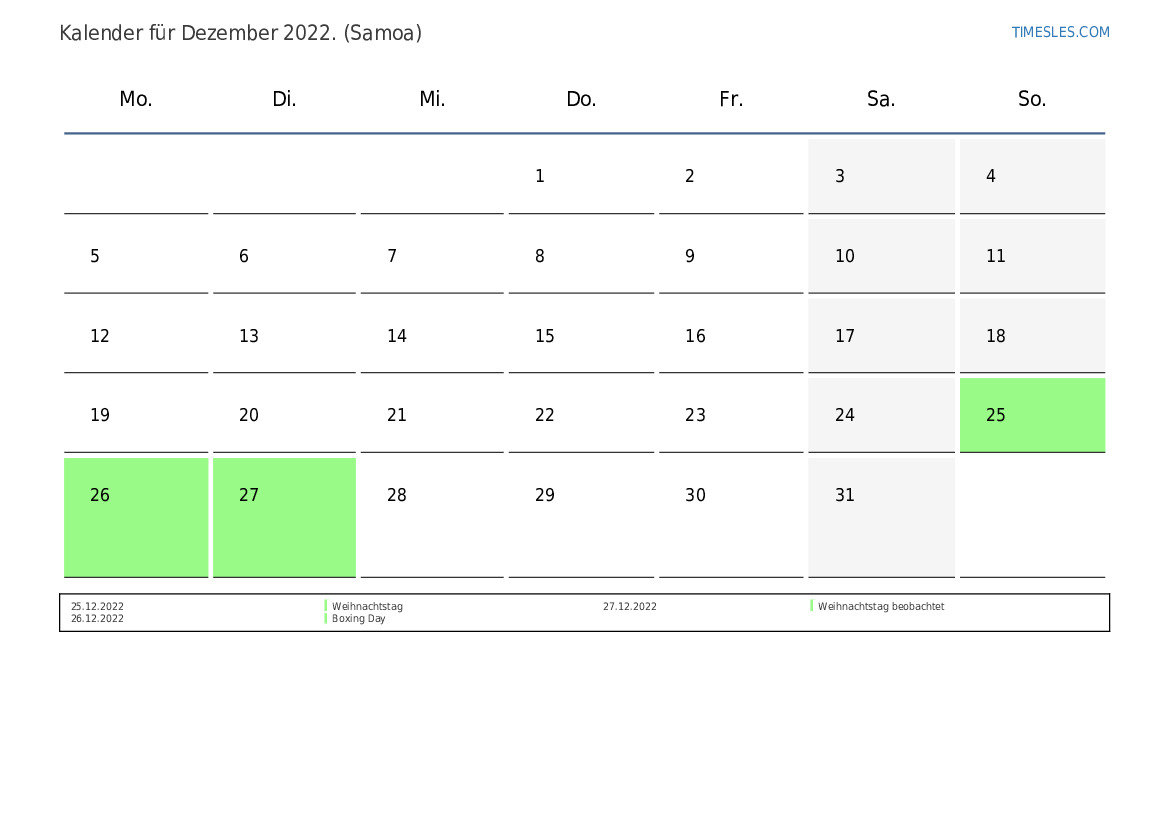 Feiertags- und Wochenendkalender für Dezember 2022 für Samoa