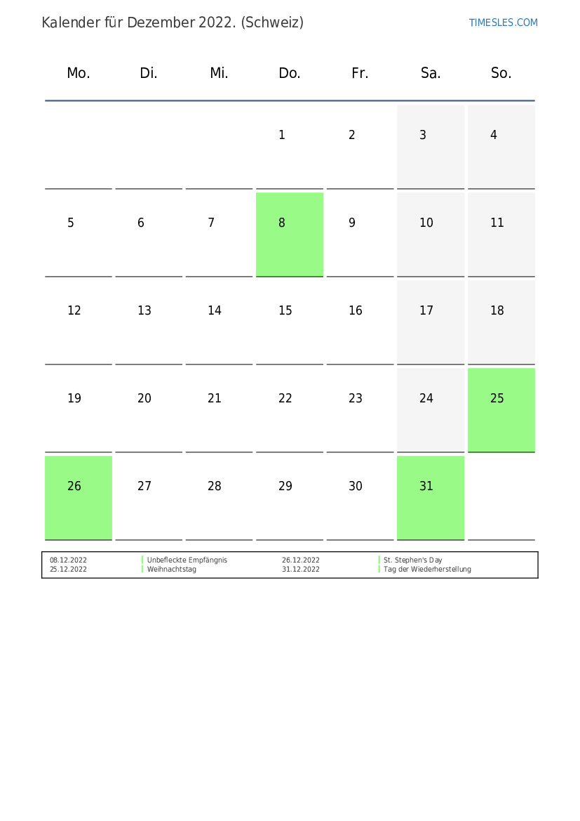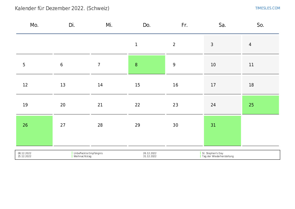 Laden Sie den PDF-Kalender mit Feiertagen und Wochenenden für Dezember 2022 für die Schweiz herunter und drucken Sie ihn aus