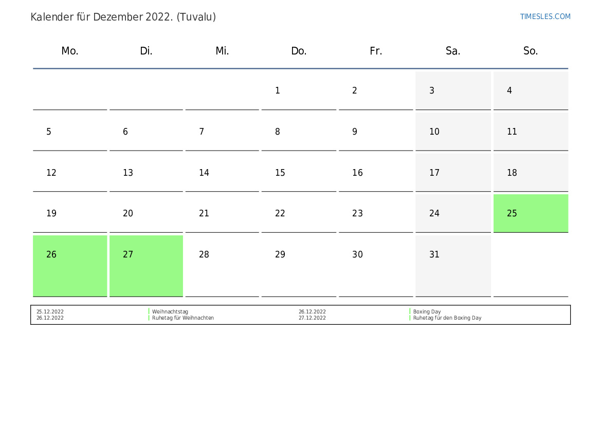 Feiertags- und Wochenendkalender für Dezember 2022 für Tuvalu