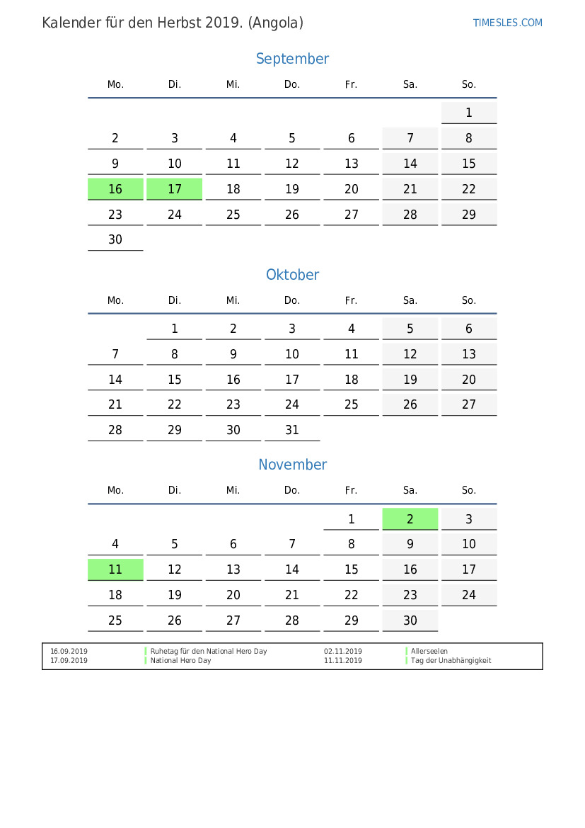 Laden Sie den PDF-Kalender mit Feiertagen und Wochenenden für den Herbst 2019 für Angola herunter und drucken Sie ihn aus