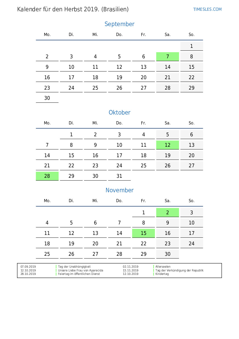 Laden Sie den PDF-Kalender mit Feiertagen und Wochenenden für den Herbst 2019 für Brasilien herunter und drucken Sie ihn aus