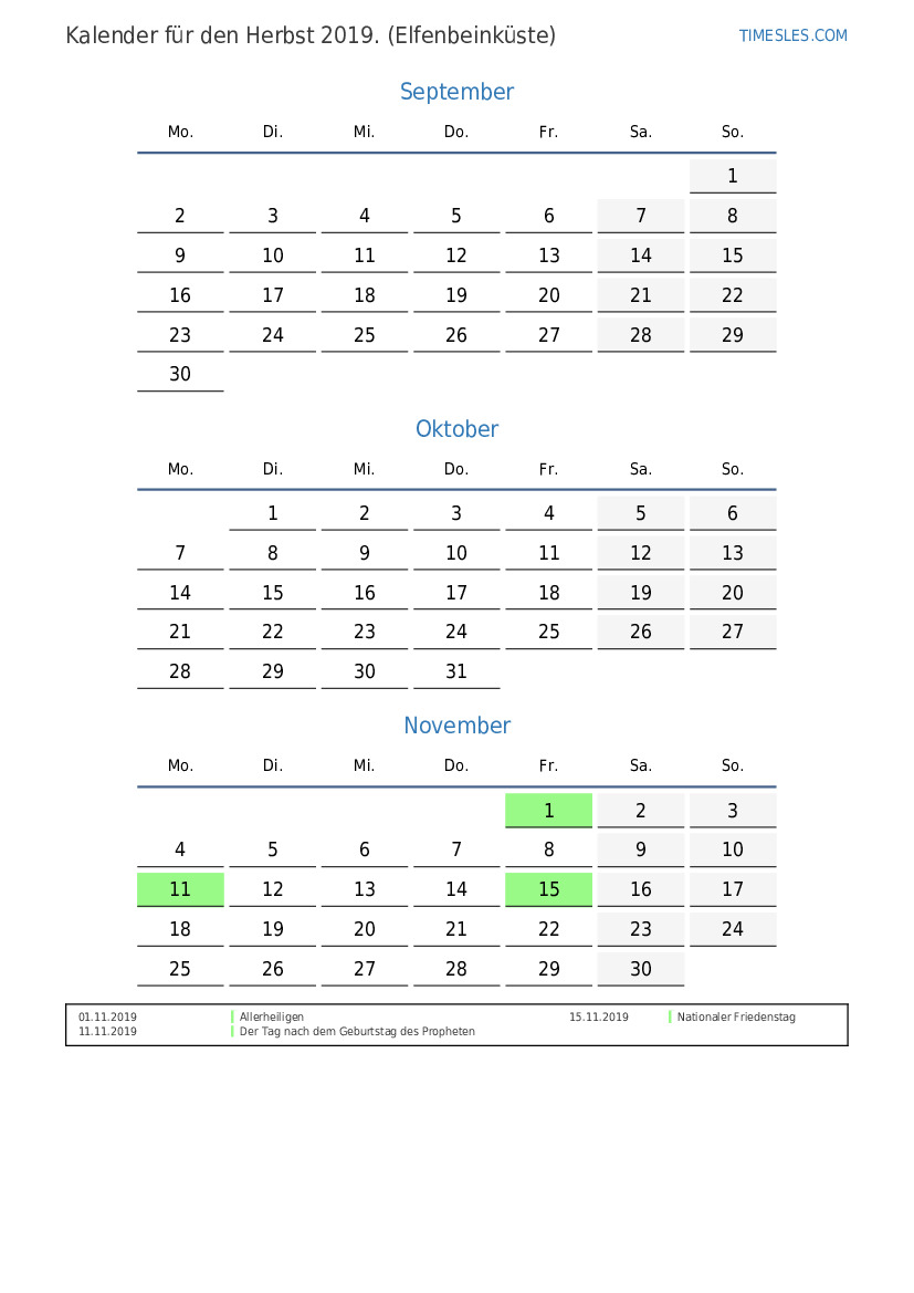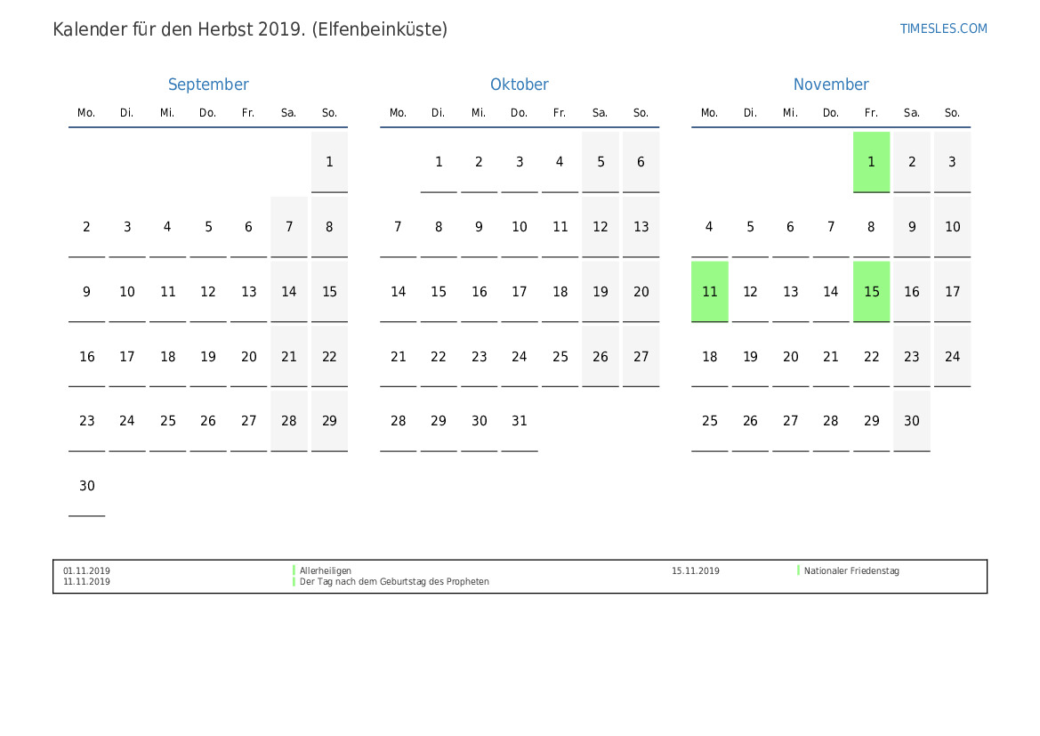 Laden Sie den PDF-Kalender mit Feiertagen und Wochenenden für den Herbst 2019 für die Elfenbeinküste herunter und drucken Sie ihn aus