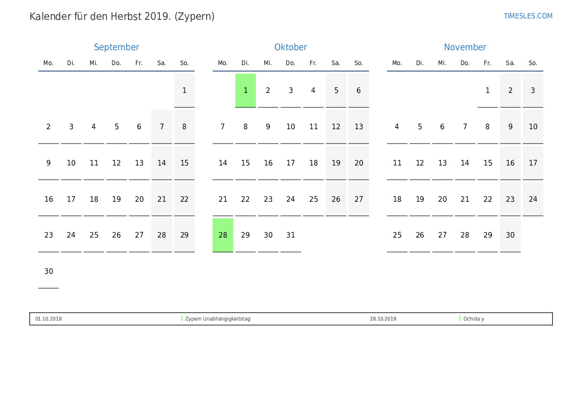 Laden Sie den PDF-Kalender mit Feiertagen und Wochenenden für den Herbst 2019 für Zypern herunter und drucken Sie ihn aus