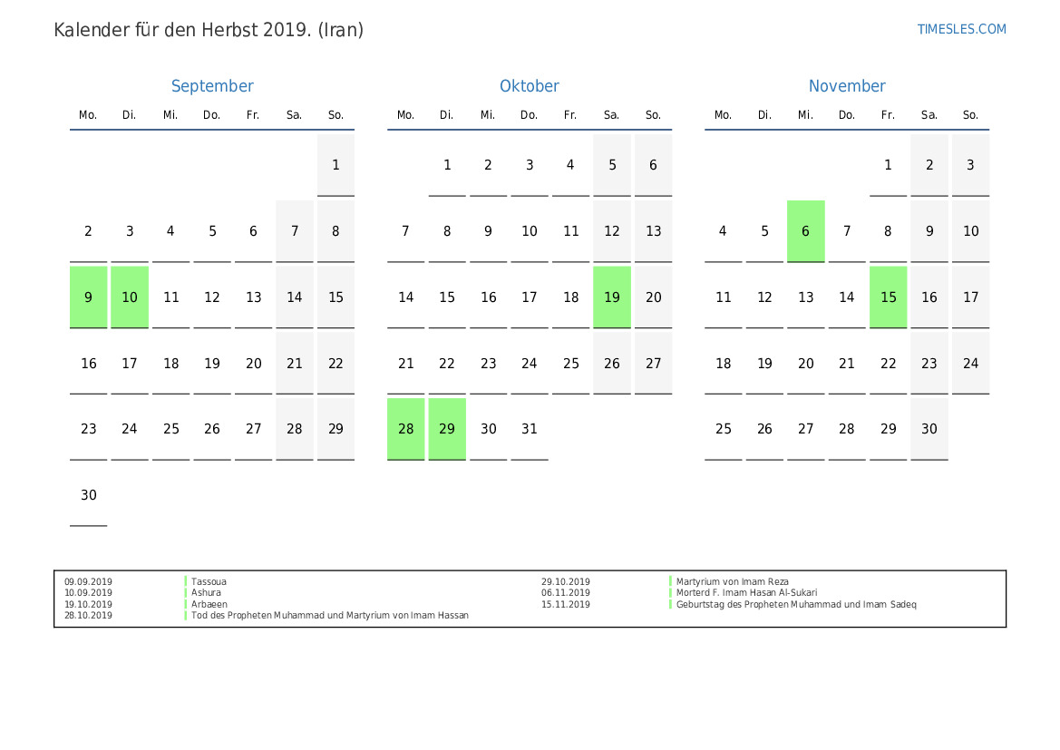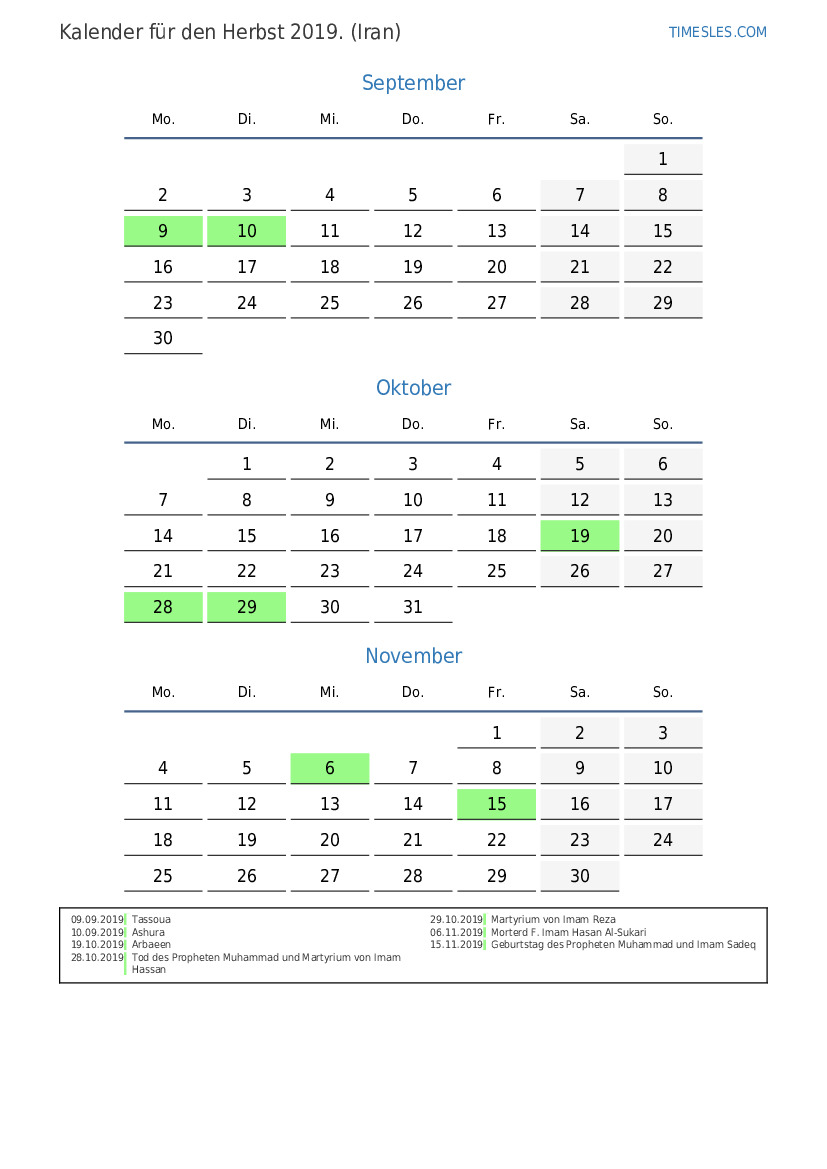 Laden Sie den PDF-Kalender mit Feiertagen und Wochenenden für den Herbst 2019 für den Iran herunter und drucken Sie ihn aus