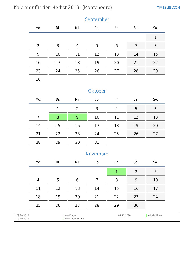 Laden Sie den PDF-Kalender mit Feiertagen und Wochenenden für den Herbst 2019 für Montenegro herunter und drucken Sie ihn aus