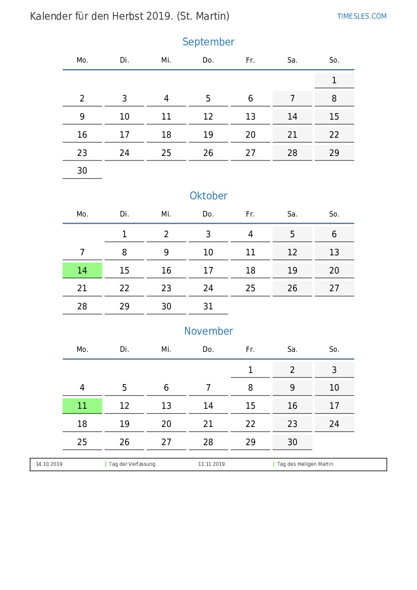 Kalender der Feiertage und Wochenenden für den Herbst 2019 für Sint Maarten