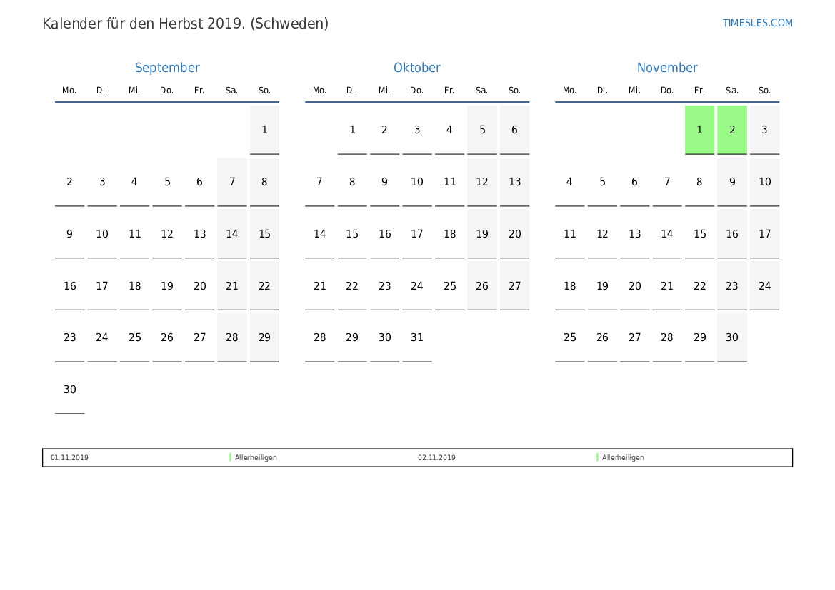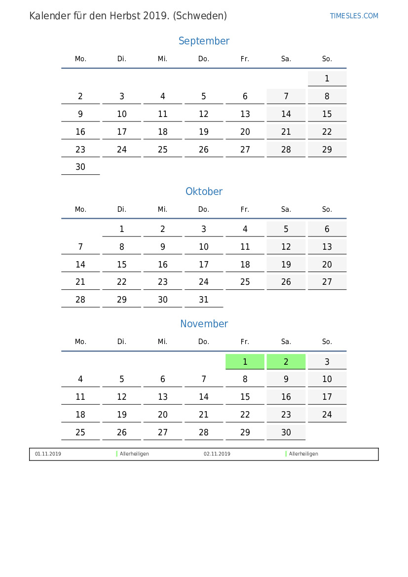 Laden Sie den PDF-Kalender mit Feiertagen und Wochenenden für den Herbst 2019 für Schweden herunter und drucken Sie ihn aus