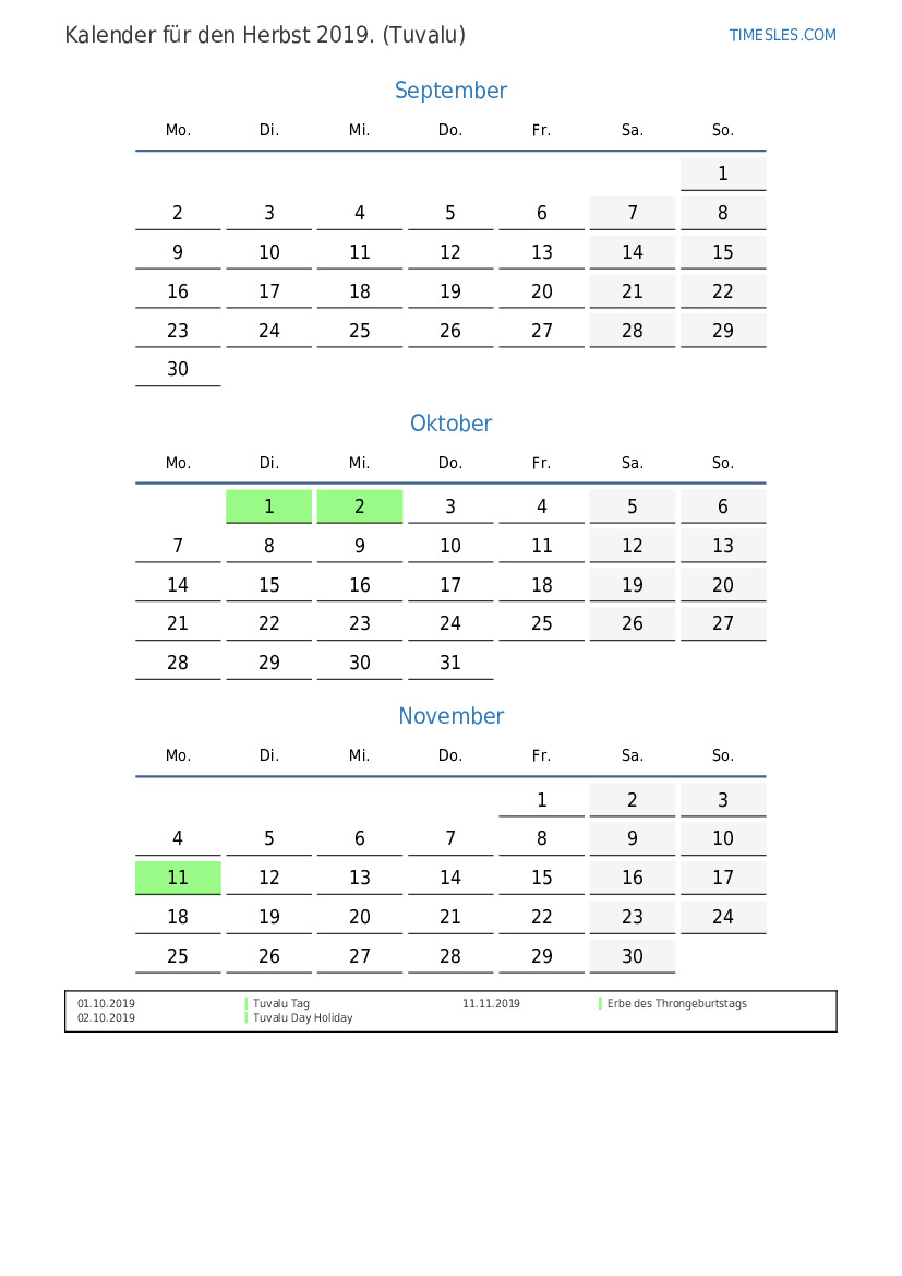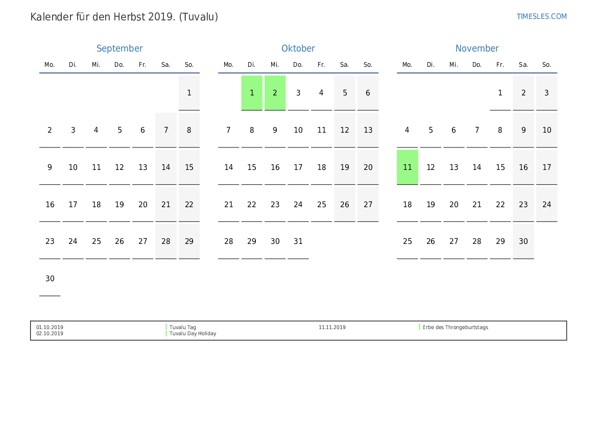 Laden Sie den PDF-Kalender mit Feiertagen und Wochenenden für den Herbst 2019 für Tuvalu herunter und drucken Sie ihn aus