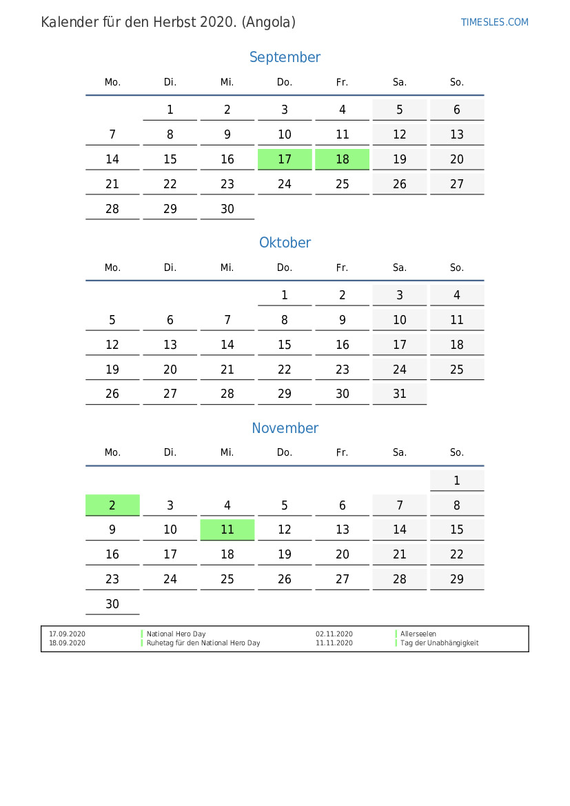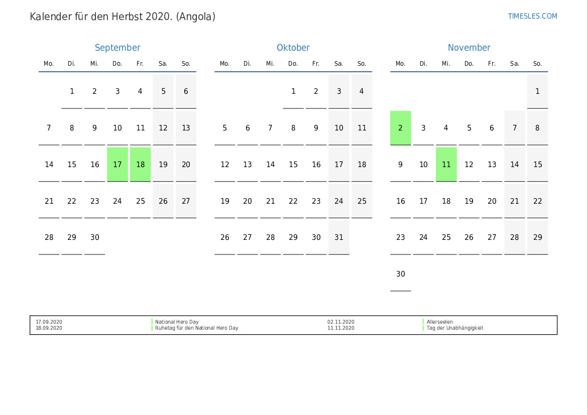 Laden Sie den PDF-Kalender mit Feiertagen und Wochenenden für den Herbst 2020 für Angola herunter und drucken Sie ihn aus
