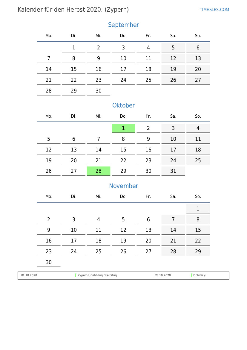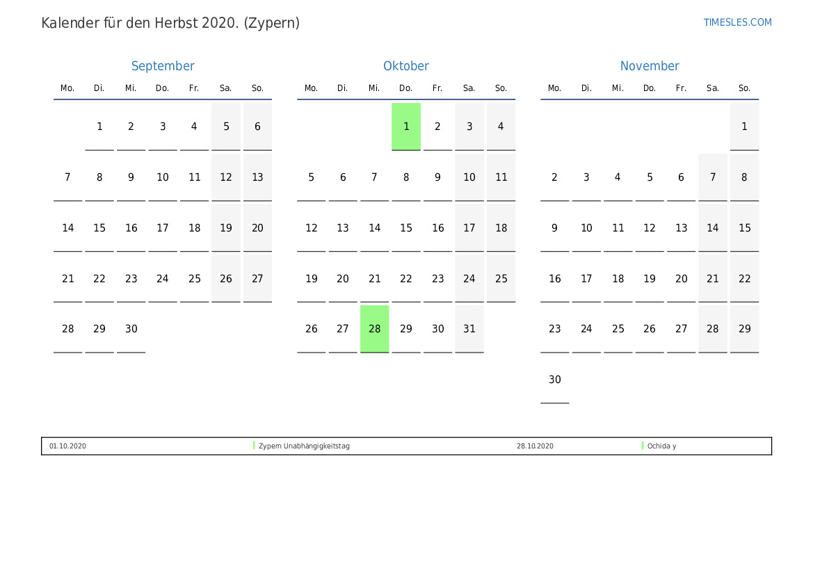 Laden Sie den PDF-Kalender mit Feiertagen und Wochenenden für den Herbst 2020 für Zypern herunter und drucken Sie ihn aus