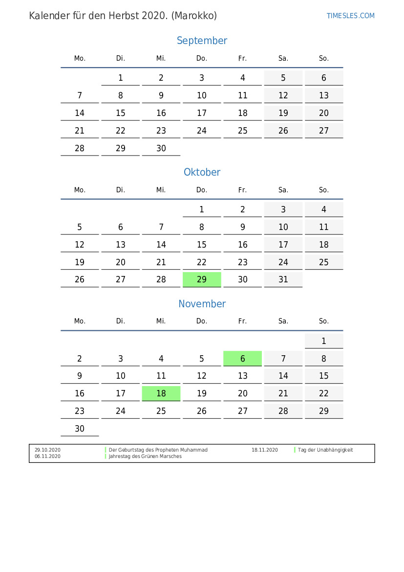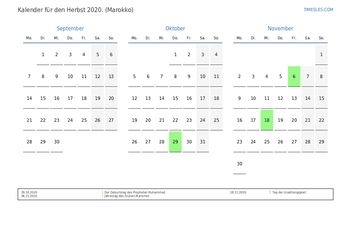 Laden Sie den PDF-Kalender mit Feiertagen und Wochenenden für den Herbst 2020 für Marokko herunter und drucken Sie ihn aus