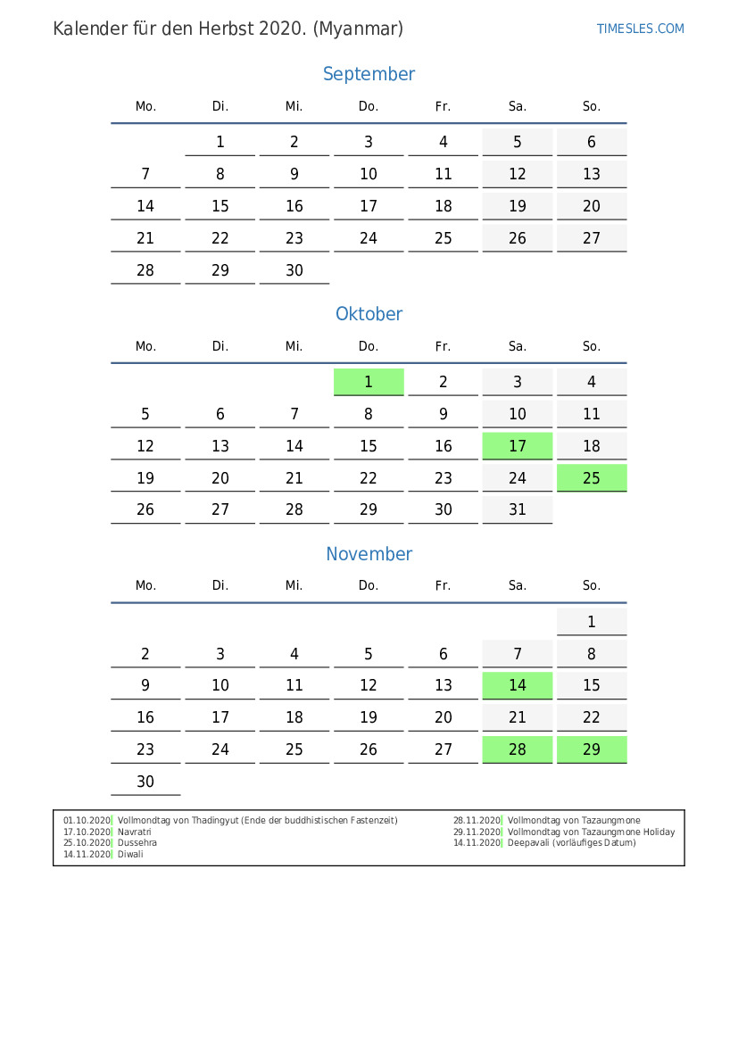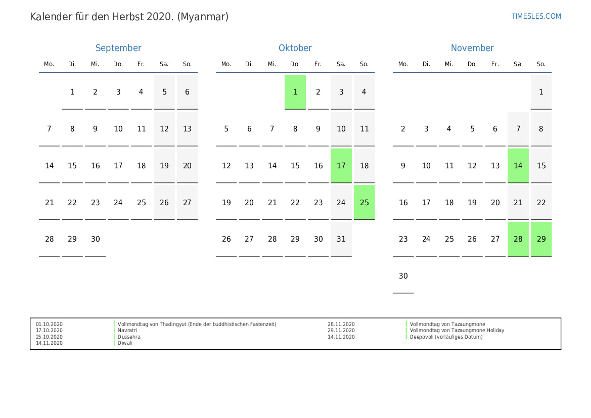 Laden Sie den PDF-Kalender mit Feiertagen und Wochenenden für den Herbst 2020 für Myanmar herunter und drucken Sie ihn aus