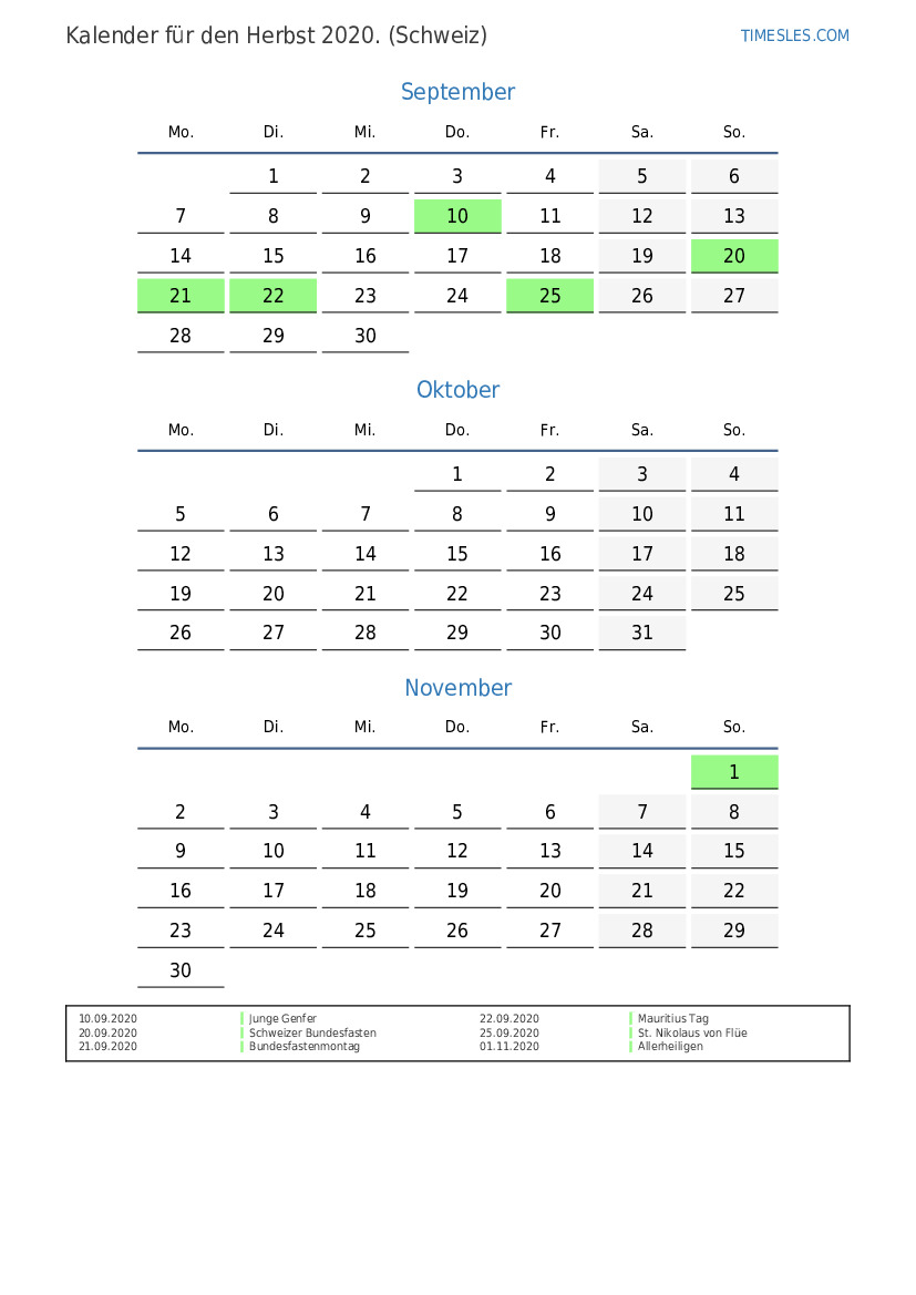 Laden Sie den PDF-Kalender mit Feiertagen und Wochenenden für den Herbst 2020 für die Schweiz herunter und drucken Sie ihn aus