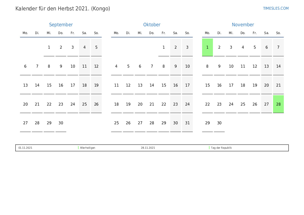 Laden Sie den PDF-Kalender mit Feiertagen und Wochenenden für den Herbst 2021 für den Kongo herunter und drucken Sie ihn aus