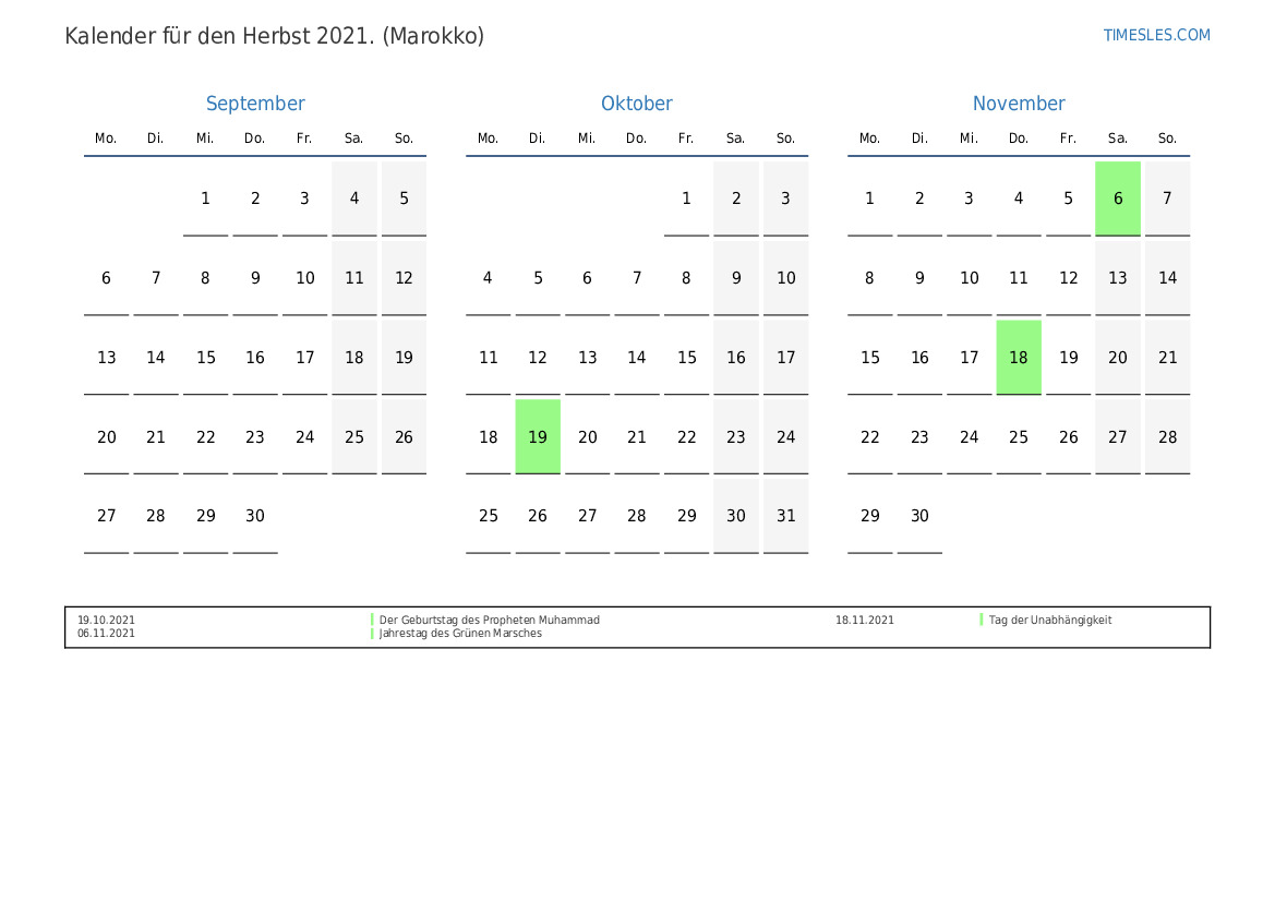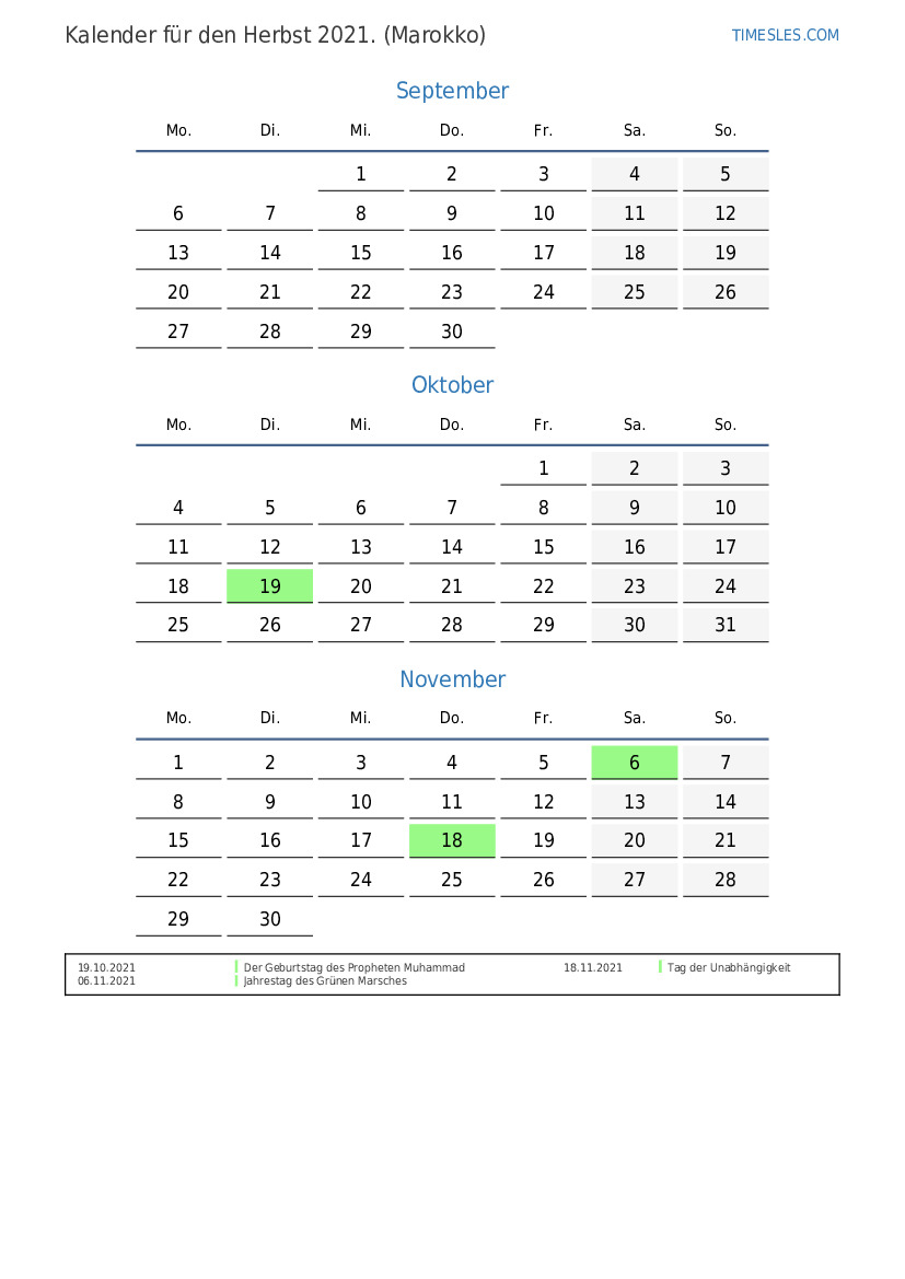 Laden Sie den PDF-Kalender mit Feiertagen und Wochenenden für den Herbst 2021 für Marokko herunter und drucken Sie ihn aus