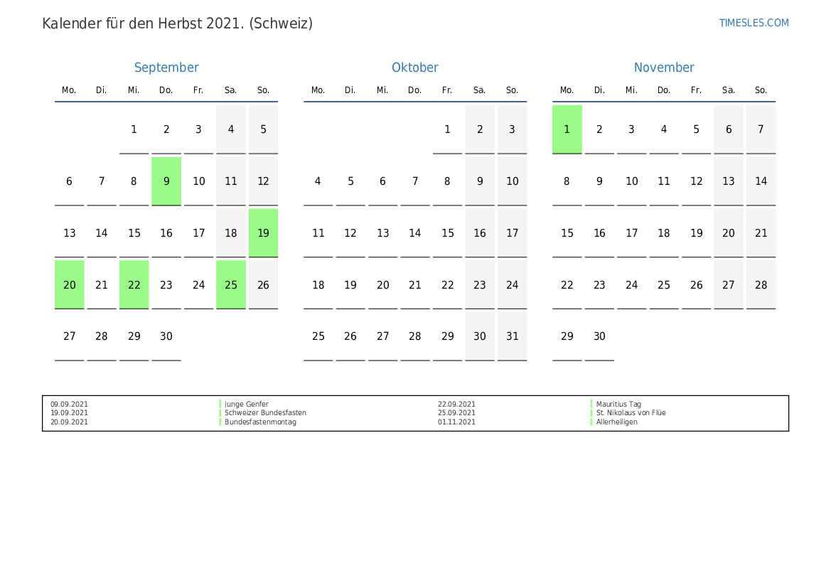 Laden Sie den PDF-Kalender mit Feiertagen und Wochenenden für den Herbst 2021 für die Schweiz herunter und drucken Sie ihn aus
