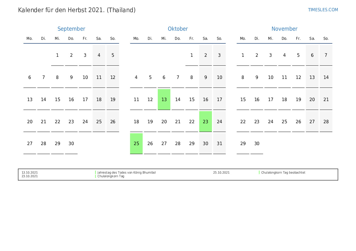 Kalender der Feiertage und Wochenenden für den Herbst 2021 für Thailand