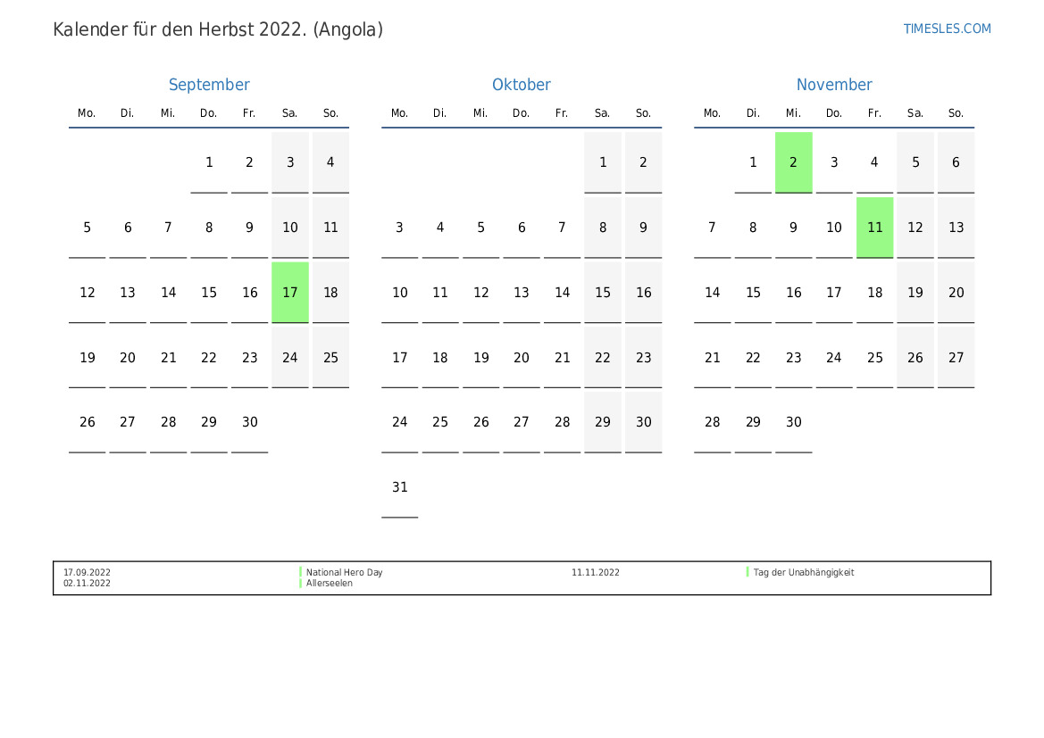 Kalender der Feiertage und Wochenenden für den Herbst 2022 für Angola