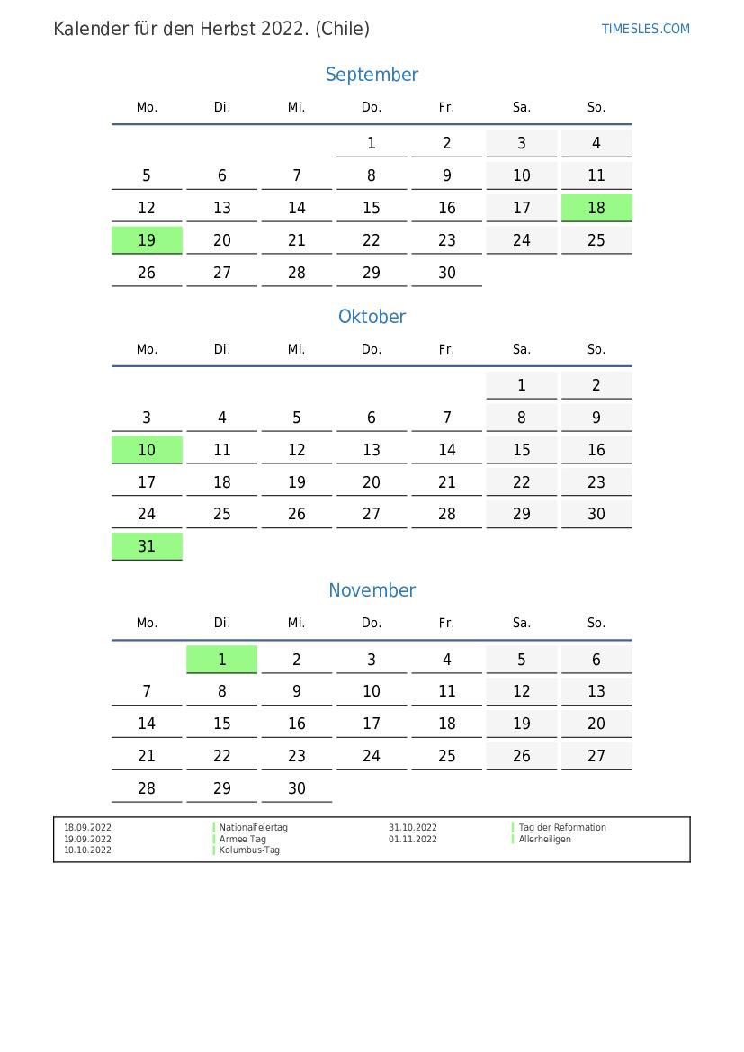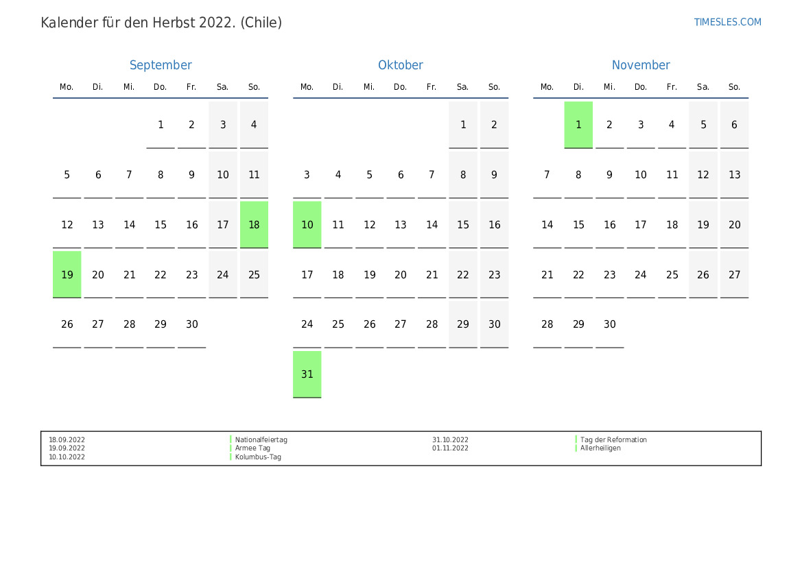 Kalender der Feiertage und Wochenenden für den Herbst 2022 für Chile