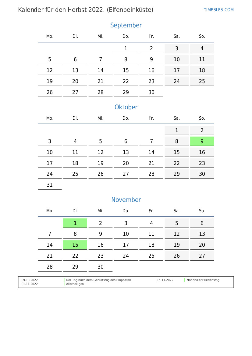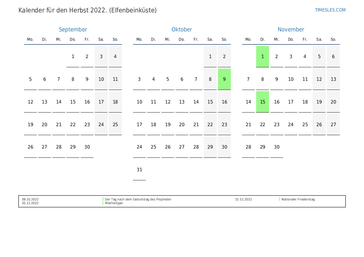 Laden Sie den PDF-Kalender mit Feiertagen und Wochenenden für den Herbst 2022 für die Elfenbeinküste herunter und drucken Sie ihn aus