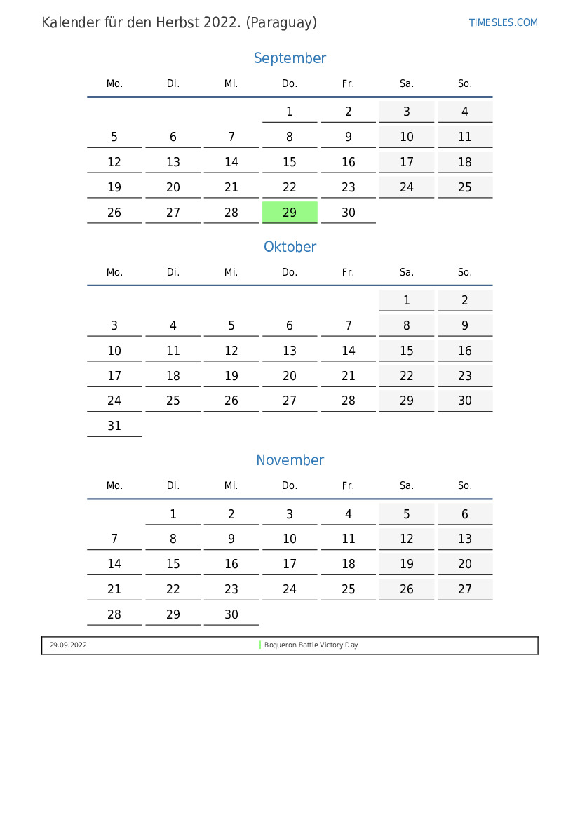 Kalender der Feiertage und Wochenenden für den Herbst 2022 für Paraguay