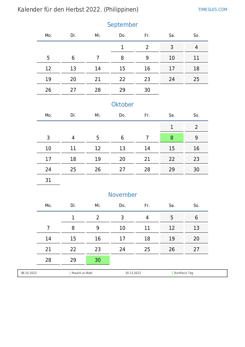 Kalender der Feiertage und Wochenenden für den Herbst 2022 für die Philippinen
