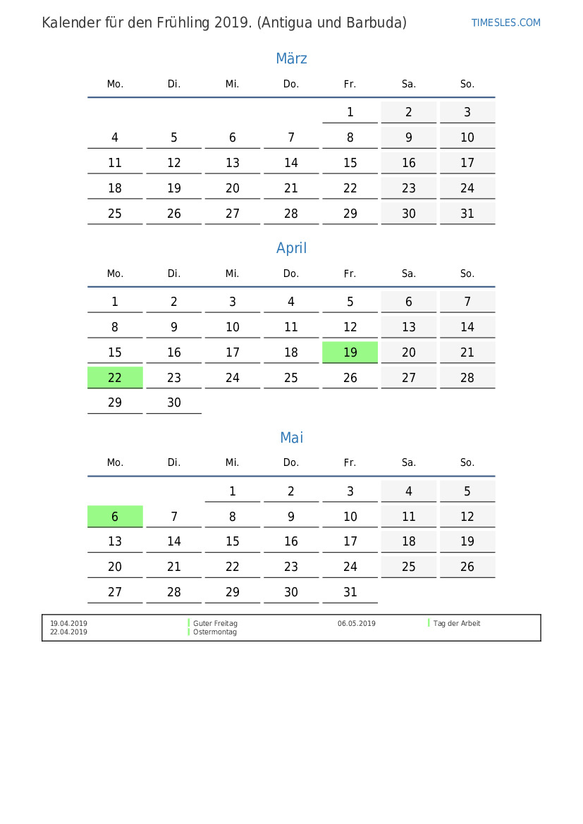 Laden Sie den PDF-Kalender mit Feiertagen und Wochenenden für den Frühling 2019 für Antigua und Barbuda herunter und drucken Sie ihn aus