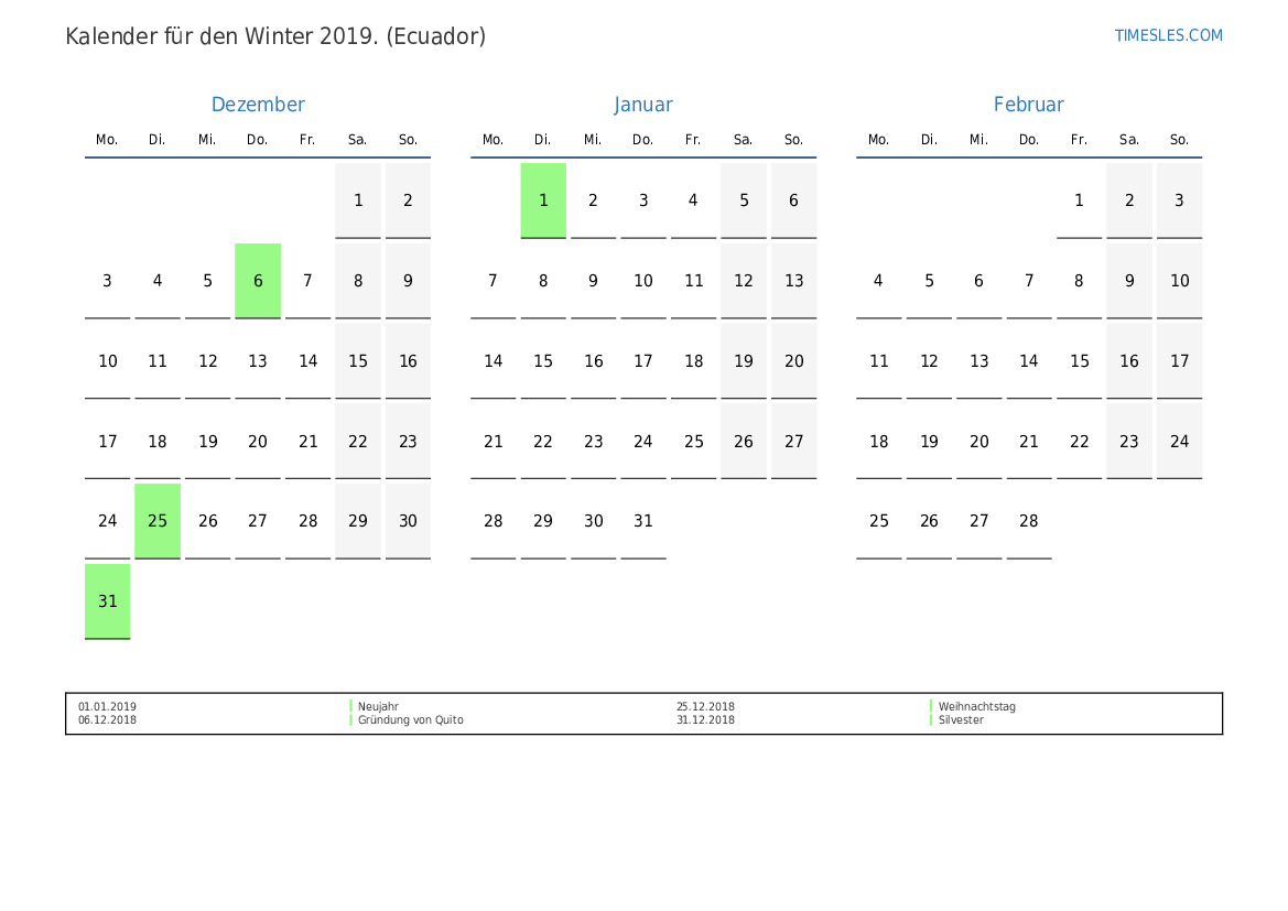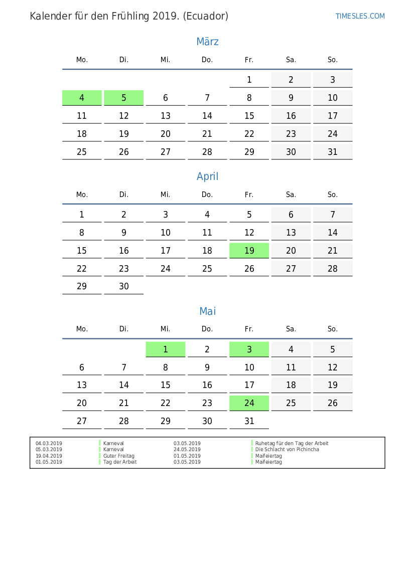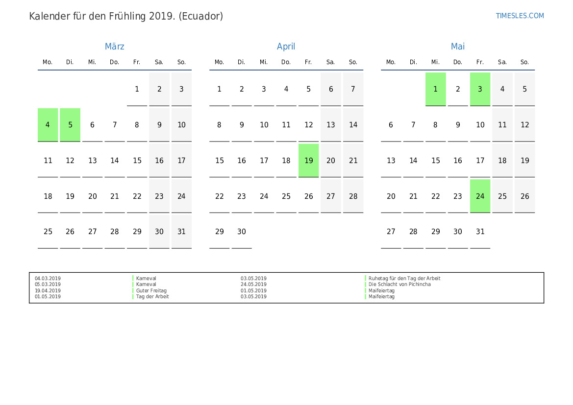 Laden Sie den PDF-Kalender mit Feiertagen und Wochenenden für den Frühling 2019 für Ecuador herunter und drucken Sie ihn aus