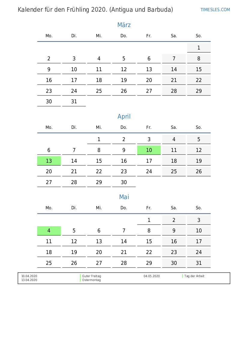 Laden Sie den PDF-Kalender mit Feiertagen und Wochenenden für den Frühling 2020 für Antigua und Barbuda herunter und drucken Sie ihn aus