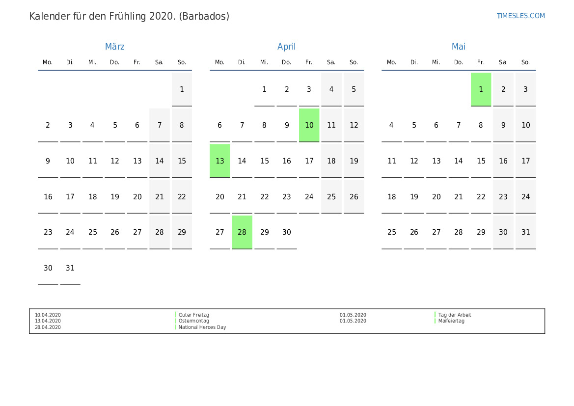Laden Sie den PDF-Kalender mit Feiertagen und Wochenenden für den Frühling 2020 für Barbados herunter und drucken Sie ihn aus