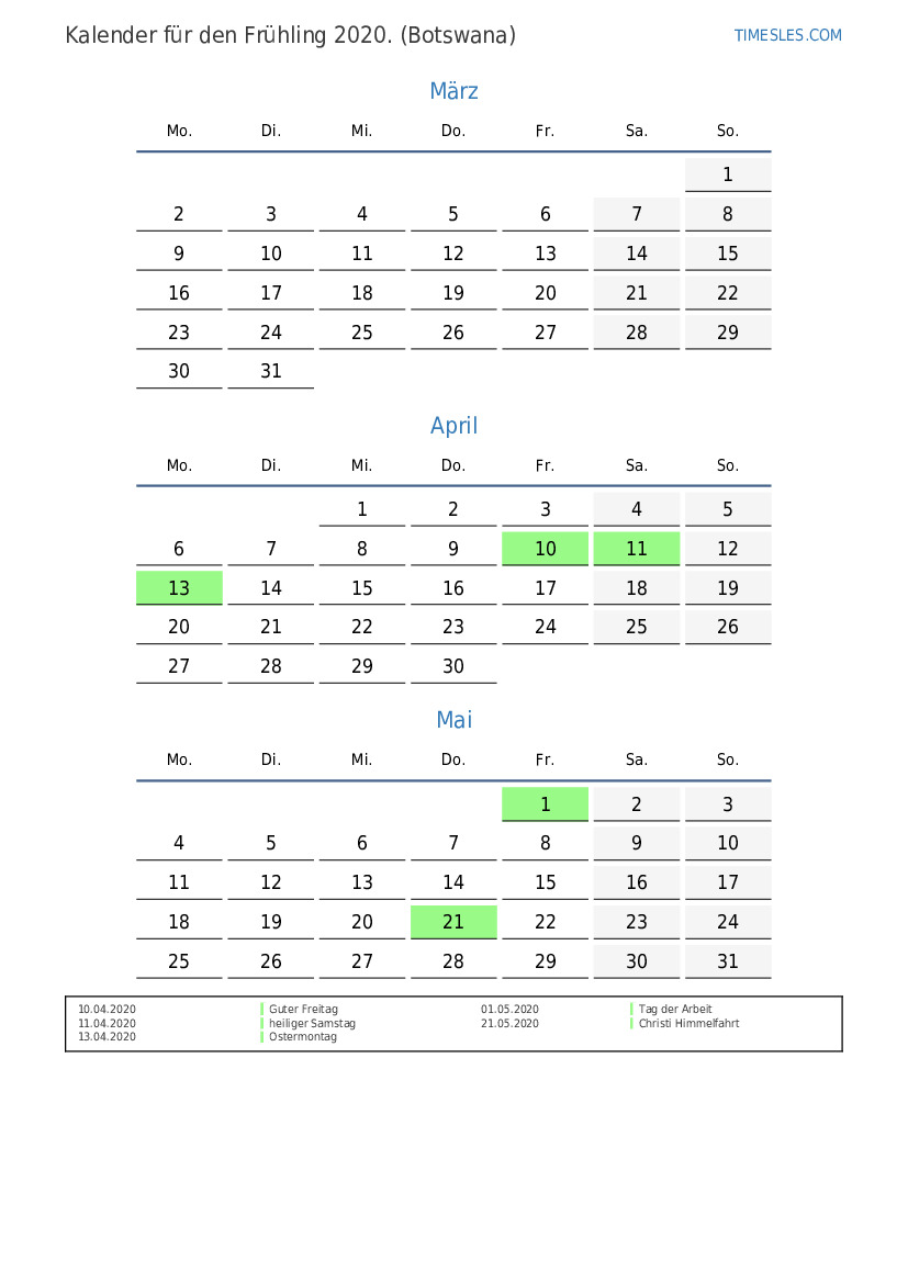 Laden Sie den PDF-Kalender mit Feiertagen und Wochenenden für den Frühling 2020 für Botswana herunter und drucken Sie ihn aus